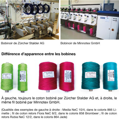 Le coton mercerisé est désormais enroulé sur la bobineuse de Minnotex GmbH, qui est beaucoup plus rapide et précise que la machine de Zürcher Stalder AG. Cela signifie que les bobines seront plus compactes et plus petites. Cependant, il s’agit du même fil, en même quantité, sur les nouvelles bobines que sur les anciennes.